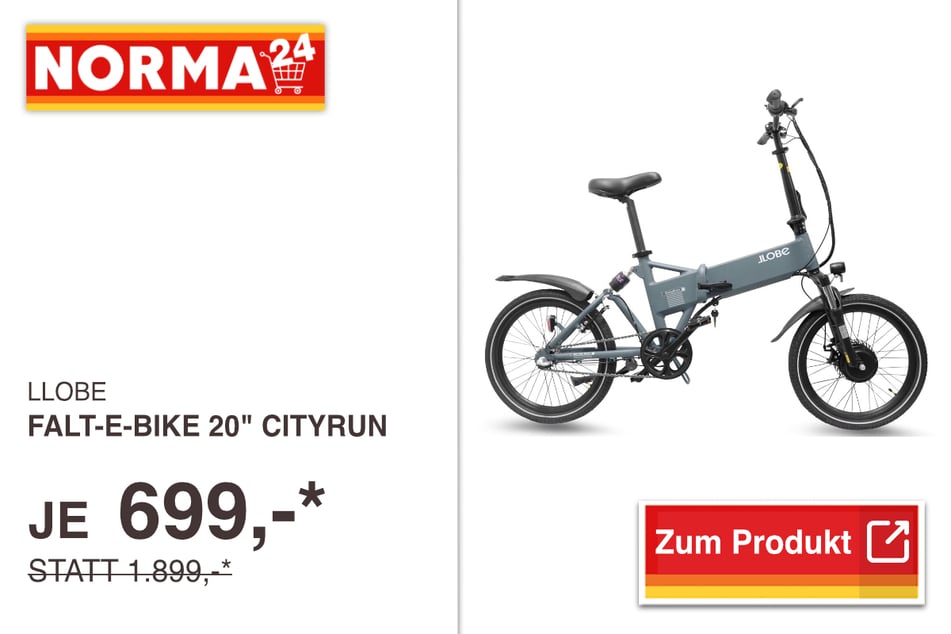 Zum Beispiel gibt's das Llobe Falt-e-Bike 20'' Cityrun für 699 statt 1.899 Euro* mit einem leistungsstarken Motor.