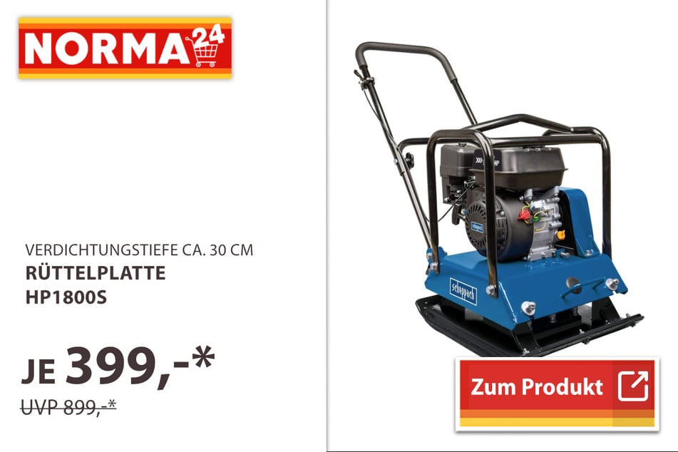 Darunter Benzin-Hochdruck-Reiniger für 299 statt 339 Euro*, Kassettenbetten mit Zirbenholz für 39,99 Euro*, Rüttelplatten für 399 statt 899 Euro* und Fensterreinigungs-Roboter für 169 statt 299 Euro*.