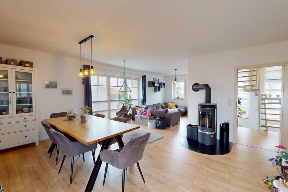 Der Mittelpunkt des Hauses aus dem Jahr 1996 liegt im Erdgeschoss: Ein großzügiger Wohn- und Essbereich schafft Raum für gemeinsames Leben und wird durch einen modernen Kamin, der erst 2024 eingebaut wurde, besonders gemütlich. Ergänzt wird die Etage durch eine Küche sowie ein modernisiertes Gäste-WC.