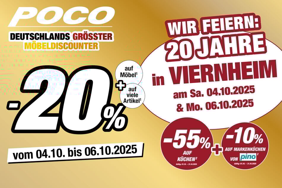 ¹Gültig vom 04.10. bis 06.10.2025 in allen Märkten und auf www.poco.de. Gilt nicht für „nur Online“ Artikel. Nicht kombinierbar mit anderen Rabattaktionen. Gilt nicht auf bereits reduzierte Ware.