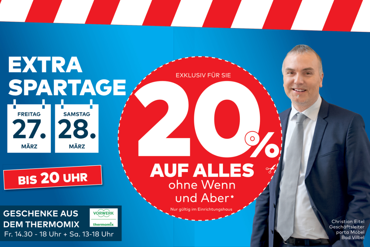 Bad Vilbel – Am Freitag (27.3.) und Samstag (28.3.) dreht sich bei porta in Bad Vilbel alles ums Sparen – die Extra Spartage warten quer durch alle Abteilungen mit attraktiven Angeboten.