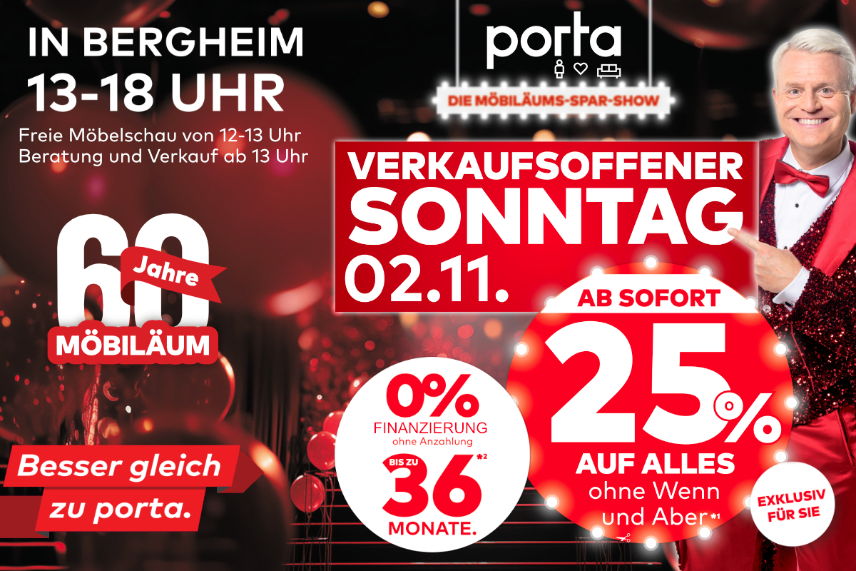 Bergheim – Anlässlich des 60. Möbiläums steht bei porta in Bergheim ein Shopping-Highlight an! Besucher dürfen sich am verkaufsoffenen Sonntag (2.11.) auf sechs Stunden entspanntes Bummeln freuen – von 13 bis 18 Uhr warten lukrative Sparmöglichkeiten.
