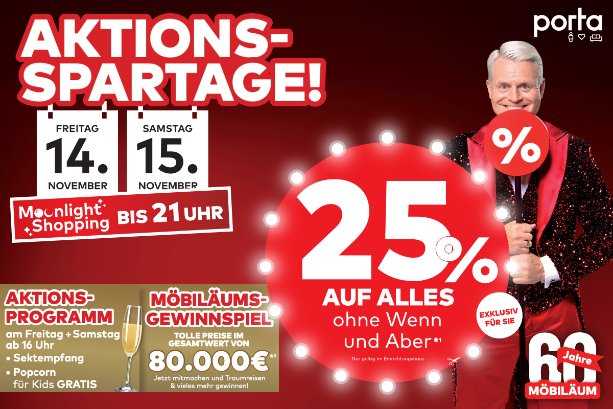 Achtung, Achtung, porta Gütersloh hat etwas Großes zu verkünden! Zur Feier des 60. Möbiläums finden am Freitag (14.11.) und Samstag (15.11.) die Aktionsspartage mit Moonlight-Shopping bis 21 Uhr statt.
