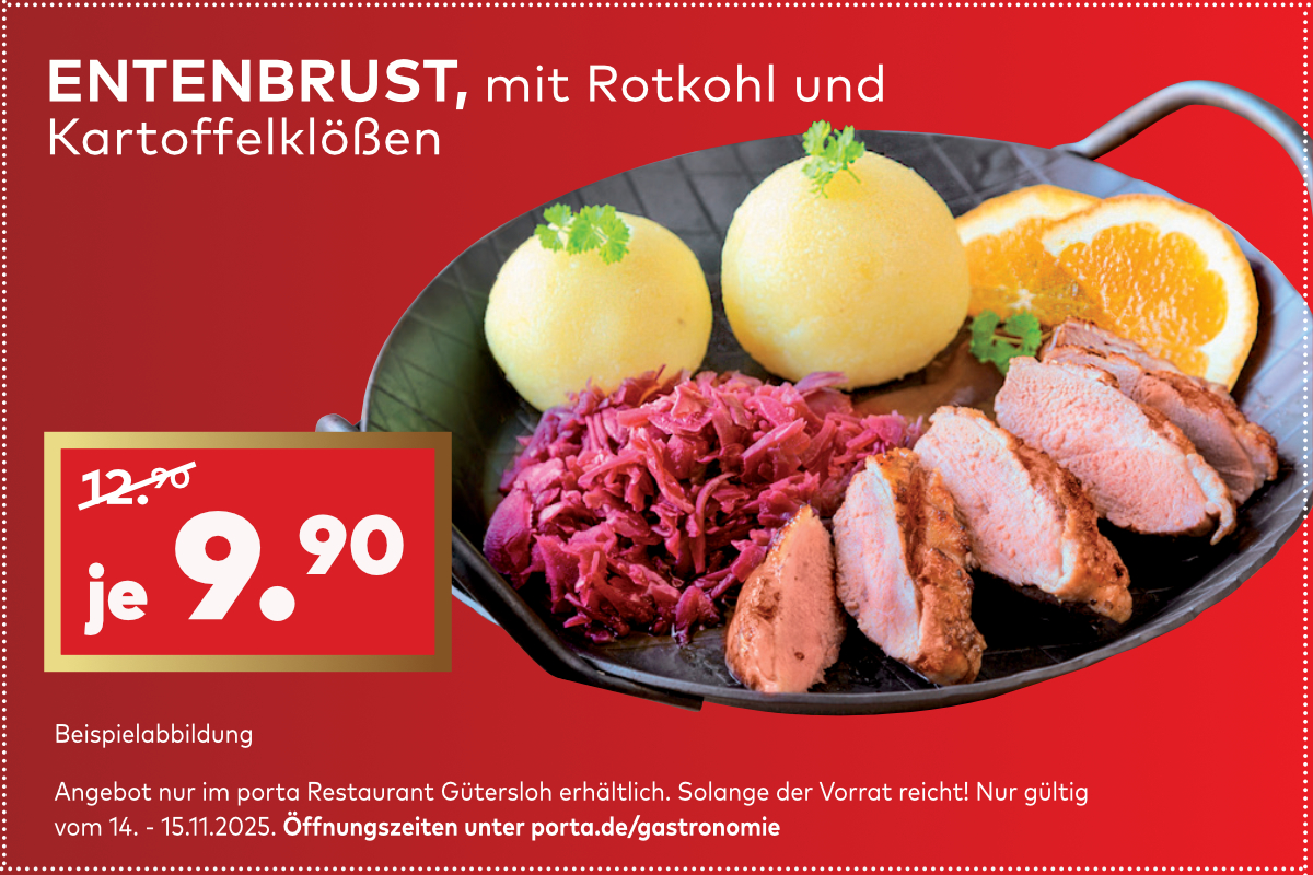 Die Entenbrust mit frischem Rotkohl und Kartoffelklößen kostet nur 9,90 statt 12,90 Euro!