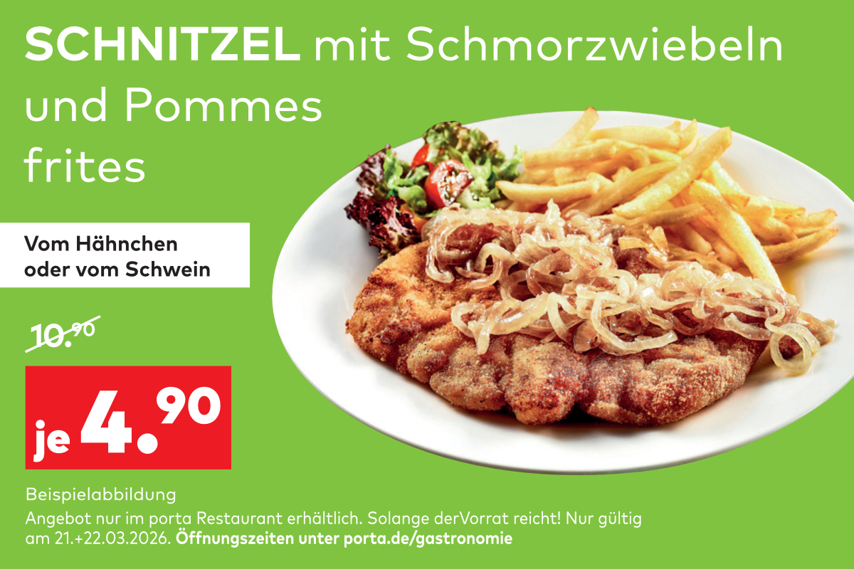 Am Samstag und Sonntag (21. + 22.3.) bekommt Ihr hier das köstliche Schnitzel mit Schmorzwiebeln und Pommes frites für gerade einmal je 4,90 statt 10,90 Euro.