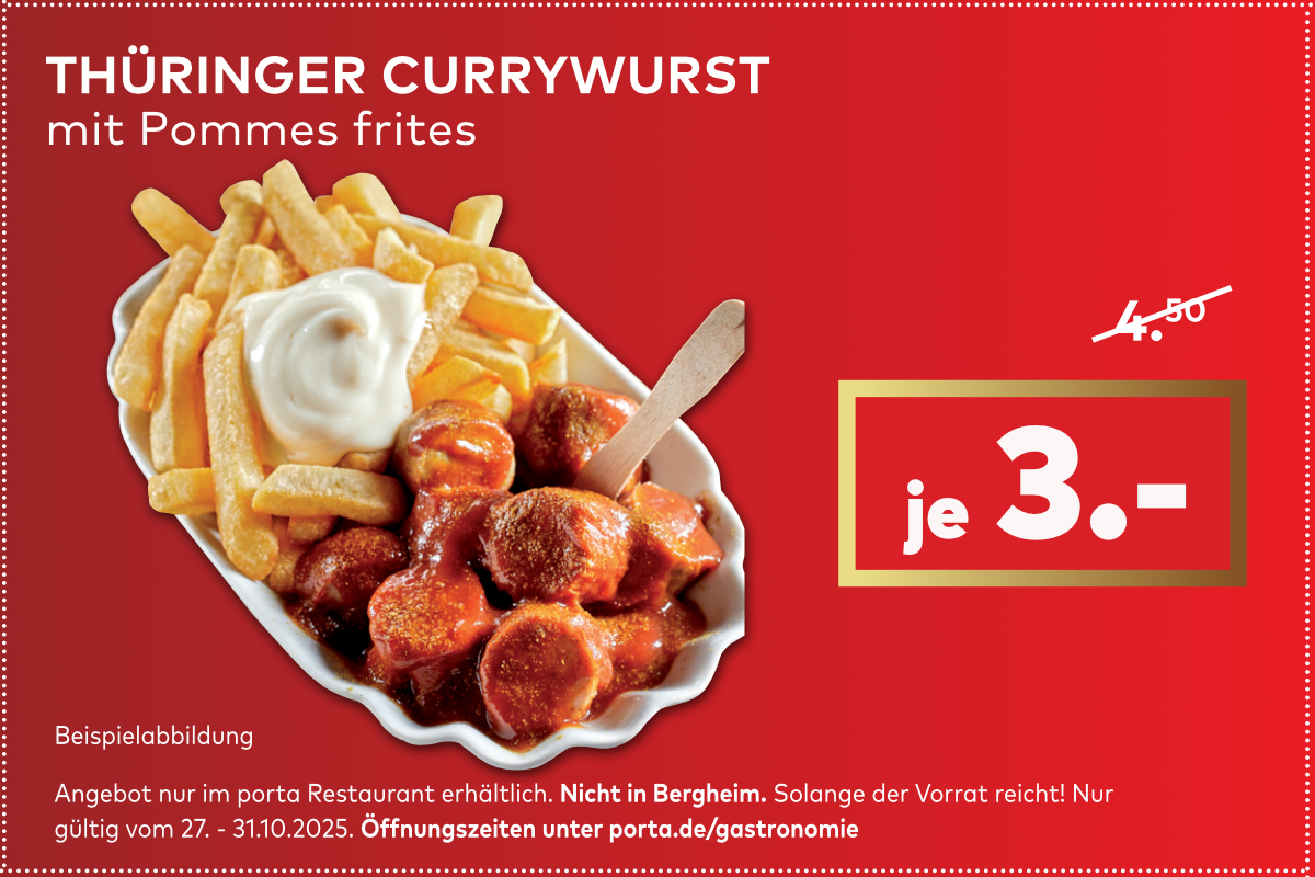 *Nicht in Verbindung mit anderen Aktionen und Rabatten. Aktionsbedingungen beim Onlinekauf siehe porta.de. Rabatt nur gültig gegen Vorlage des Coupons vom 30.-31.10.2025. Alle in Anzeigen, Prospekten, postalischen Schreiben und Newslettern angegebenen Preise sind Endpreise, die etwaige Rabatte und Aktionsvorteile bereits beinhalten. Aktion kann bei Erfolg verlängert werden.