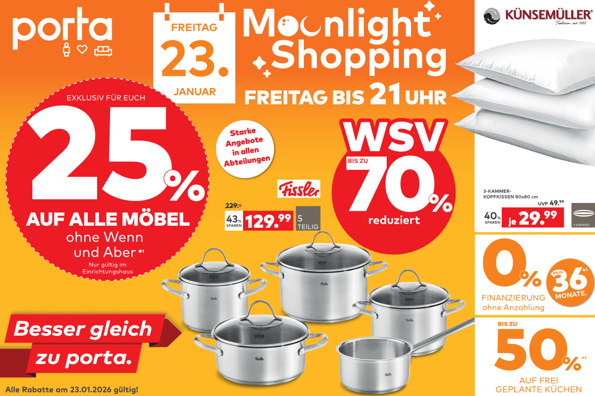 Bei porta Neuwied steht am Freitag (23.1.) das beliebte Moonlight Shopping an. Die porta-Türen bleiben bis 21 Uhr geöffnet, sodass Ihr entspannt stöbern könnt.