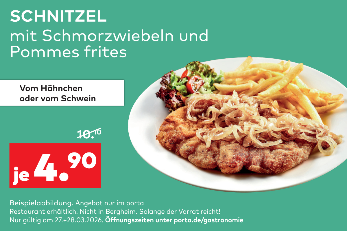 Diese halten für die Aktionstage gerade ein tolles Angebot bereit: Mit diesem Coupon (siehe Bild) gibt's das köstliche Schnitzel mit Schmorzwiebeln und Pommes frites für je nur 4,90 statt 10,10 Euro.
