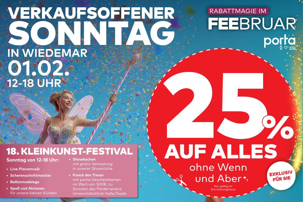 Doch beachtet: Die Rabattaktion gilt ausschließlich am Sonntag (1.2.) und nur bei porta Wiedemar. Viel Spaß beim Stöbern!