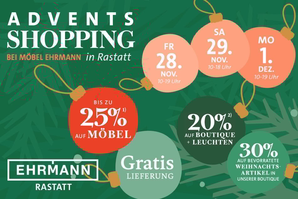 Möbel Ehrmann in Rastatt läutet den Advent mit einer coolen Aktion ein! Von Freitag (28.11.) bis Montag (1.12.) gibt's vor Ort tolle Angebote, die Euch das Einkaufen versüßen sollen.