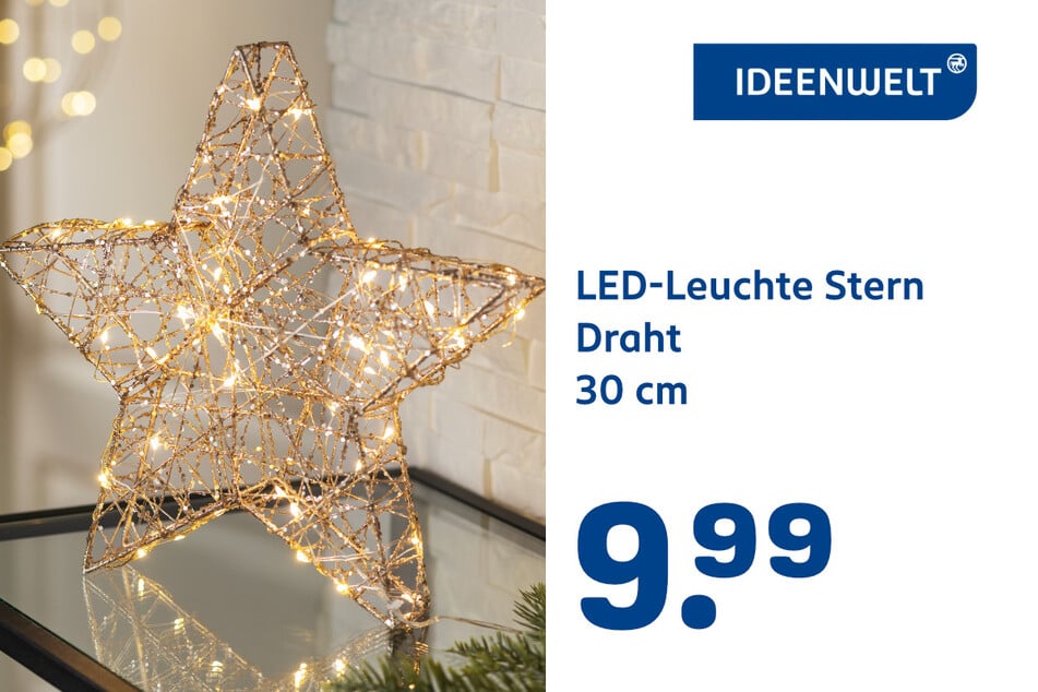 In der Ideenwelt warten LED-Leuchte Sterne für 9,99 Euro, LED-Weihnachtsbaumkerzen im 15er-Set für 19,99 Euro und Akku-Tischleuchte hellgelb für 14,99 Euro.