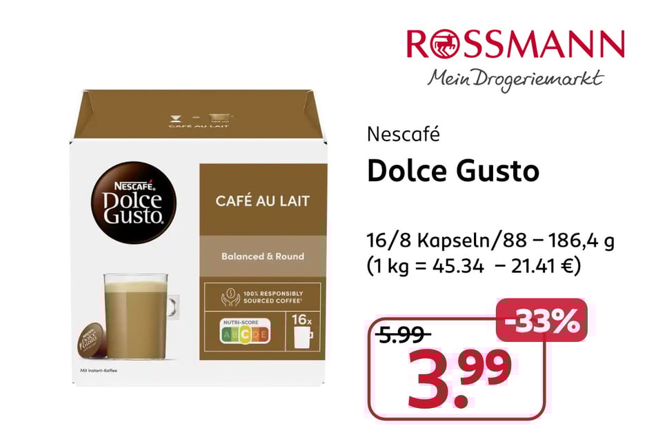Für die Maschine gibt's Nescafé Dolce Gusto für 3,99 statt 5,99 Euro. Genießt den kräftigen Robusta-Kaffee mit intensivem Charakter und cremiger Milch in nur einer Kapsel!