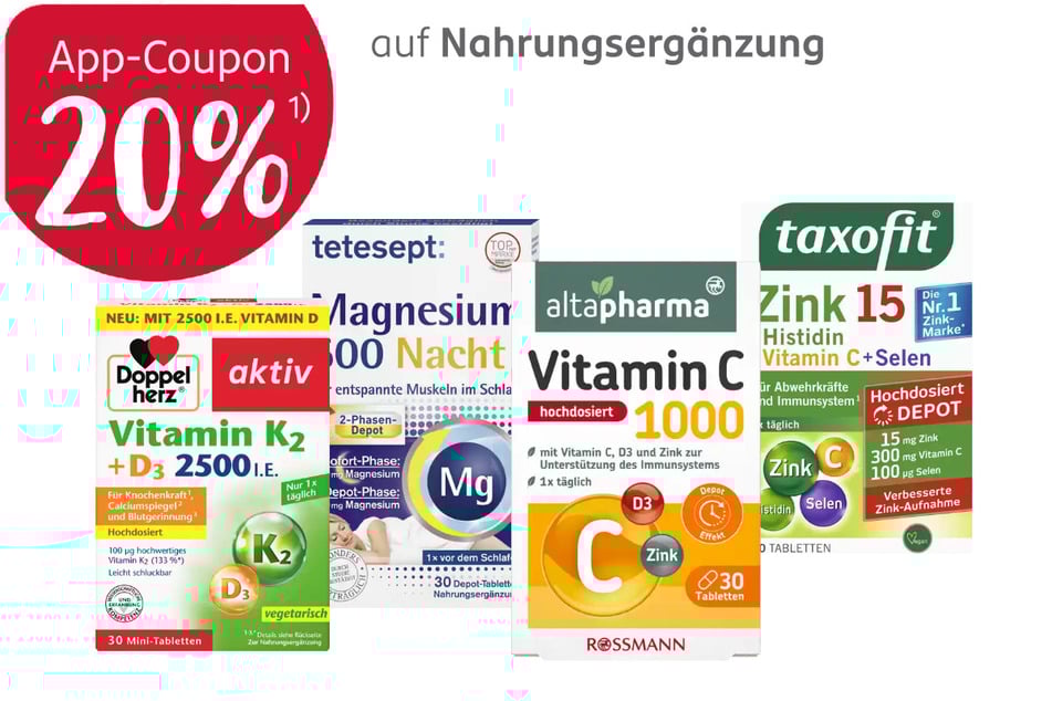 1) Gültig 10.11. – 14.11.2025. App-Coupons sind nur mit der ROSSMANN-App einlösbar. Coupon in der App aktivieren und App an der Kasse scannen. Der Rabatt wird an der Kasse abgezogen und gilt auch auf Angebotspreise. Nicht mit anderen Aktionen kombinierbar (ausgenommen 10 % auf alles). Keine Barauszahlung möglich. Bitte selbst auswählen.