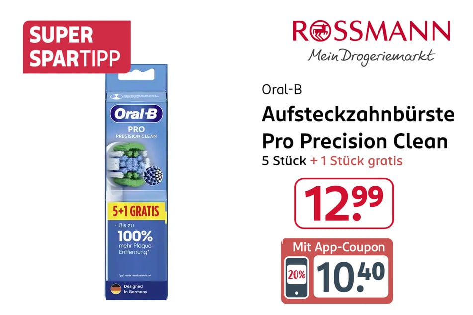 Die Oral-B Aufsteckzahnbürsten Pro Precision Clean für 12,99 Euro passen sich perfekt an jeden Zahn an und entfernen bis zu 100 Prozent mehr Plaque als eine Handzahnbürste.