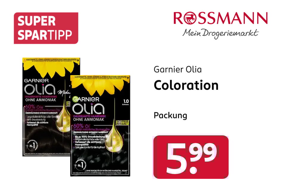 Die dauerhafte Haarfarbe von Garnier Olia für 5,99 Euro ohne Ammoniak sorgt für intensive Farbkraft und geschmeidiges, glänzendes Haar.