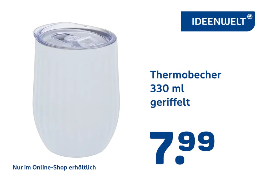 Perfekt für den Winter: Der Thermobecher 330 ml geriffelt für 7,99 Euro hält Heißgetränke länger warm. Ideal für gemütliche Tee- oder Kakaomomente an kalten Tagen.