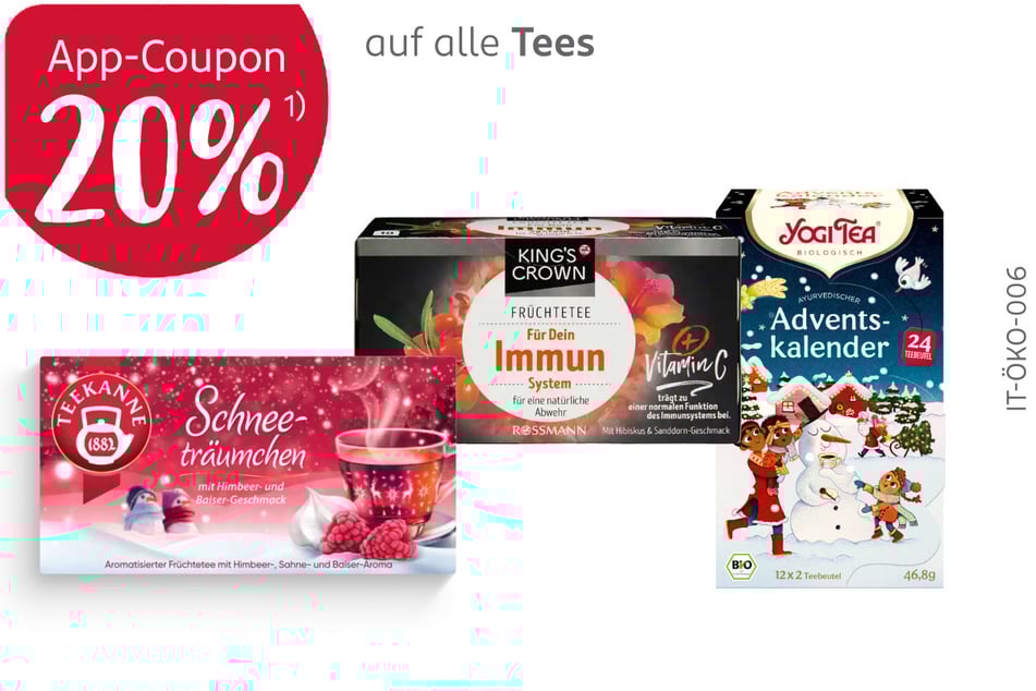 1) Gültig 13.10. – 17.10.2025. App-Coupons sind nur mit der ROSSMANN-App einlösbar. Coupon in der App aktivieren und App an der Kasse scannen. Der Rabatt wird an der Kasse abgezogen und gilt auch auf Angebotspreise. Nicht mit anderen Aktionen kombinierbar (ausgenommen 10 % auf alles). Keine Barauszahlung möglich. Bitte selbst auswählen.