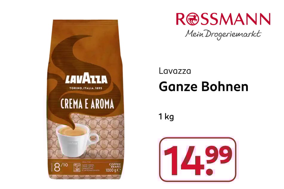 Kaffeezeit! Ab Montag (13.10.) gibt’s bei ROSSMANN das perfekte Angebot für den morgendlichen Genussmoment. Lavazza Ganze Bohnen kosten nur 14,99 Euro.