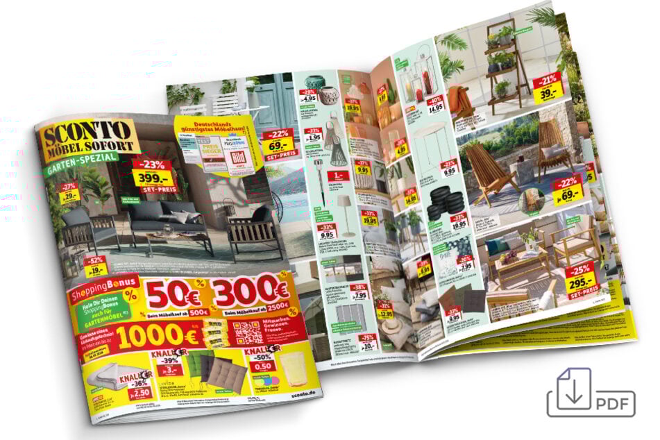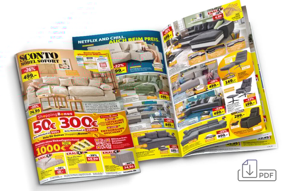 1) Bei Ihrem Einkauf von Polstermöbeln gewährt Ihnen Sconto auf einen Artikel nach Wahl einen Rabatt in Höhe des Mehrwertsteueranteils, der auf den ausgezeichneten Preis anfallen würde. Der Mehrwertsteueranteil entspricht einer Minderung von 15,96% des jeweiligen Kaufpreises. Allerdings kann Sconto aus gesetzlichen Gründen dem Kunden nicht die Mehrwertsteuer als solche erlassen, daher wird weiterhin eine Mehrwertsteuer ausgewiesen, jedoch bezieht sich diese auf einen entsprechend reduzierten Betrag. Der Kunde ist nicht berechtigt, die Erstattung des ausgewiesenen Mehrwertsteueranteils zu verlangen. Ausgenommen sind in Anzeigen und in Prospekten beworbene Artikel, die unter www.sconto.de einzusehen sind, Kaufgutscheine, Bücher, als stark reduziert gekennzeichnete Artikel, die Artikel der Marken Leonardo, Leifheit, Wesco, Emsa, Schneider Schirme, Metaltex und Ritzenhoff & Breker sowie Top-Preis-Artikel, Lebensmittel, Drogerie- und Elektroartikel, Dienstleistungen und Mietgebühren. Alle Preise in Anzeigen und Prospekten sind Endpreise. Nicht mit anderen Aktionen kombinierbar. Keine Barauszahlung möglich. Gültig für Neukäufe vom 17.04. bis 20.04.2026.