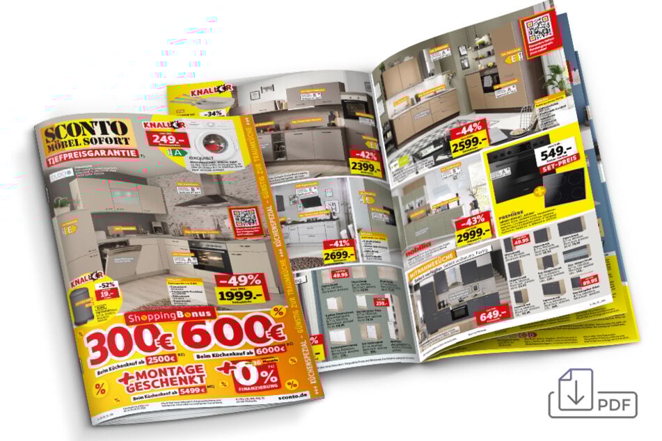 4) Bei Ihrem Einkauf von Küchen gewährt Ihnen Sconto ab einem Einkaufswert von 2.500€ einen Gutschein in Höhe von 300€. Ab einem Einkaufswert von 6.000€ gewährt Sconto Ihnen einen Gutschein in Höhe von 600€. Pro Haushalt und Einkauf nur einmal einlösbar. Ausgenommen sind in Anzeigen und in Prospekten beworbene Artikel, die unter www.sconto.de einzusehen sind, Kaufgutscheine, Bücher, als stark reduziert gekennzeichnete Artikel, die Artikel der Marken Leonardo, Leifheit, Wesco, Emsa, Schneider Schirme, Metaltex und Ritzenhoff & Breker sowie Top-Preis-Artikel, Lebensmittel, Drogerie und Elektroartikel, Dienstleistungen und Mietgebühren. Alle Preise in Anzeigen und Prospekten sind Endpreise. Nicht mit anderen Aktionen kombinierbar. Keine Barauszahlung möglich. Gültig für Neukäufe von 08.04. bis 06.05.2026.