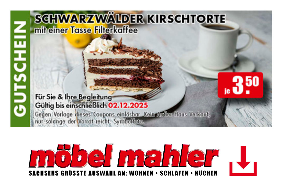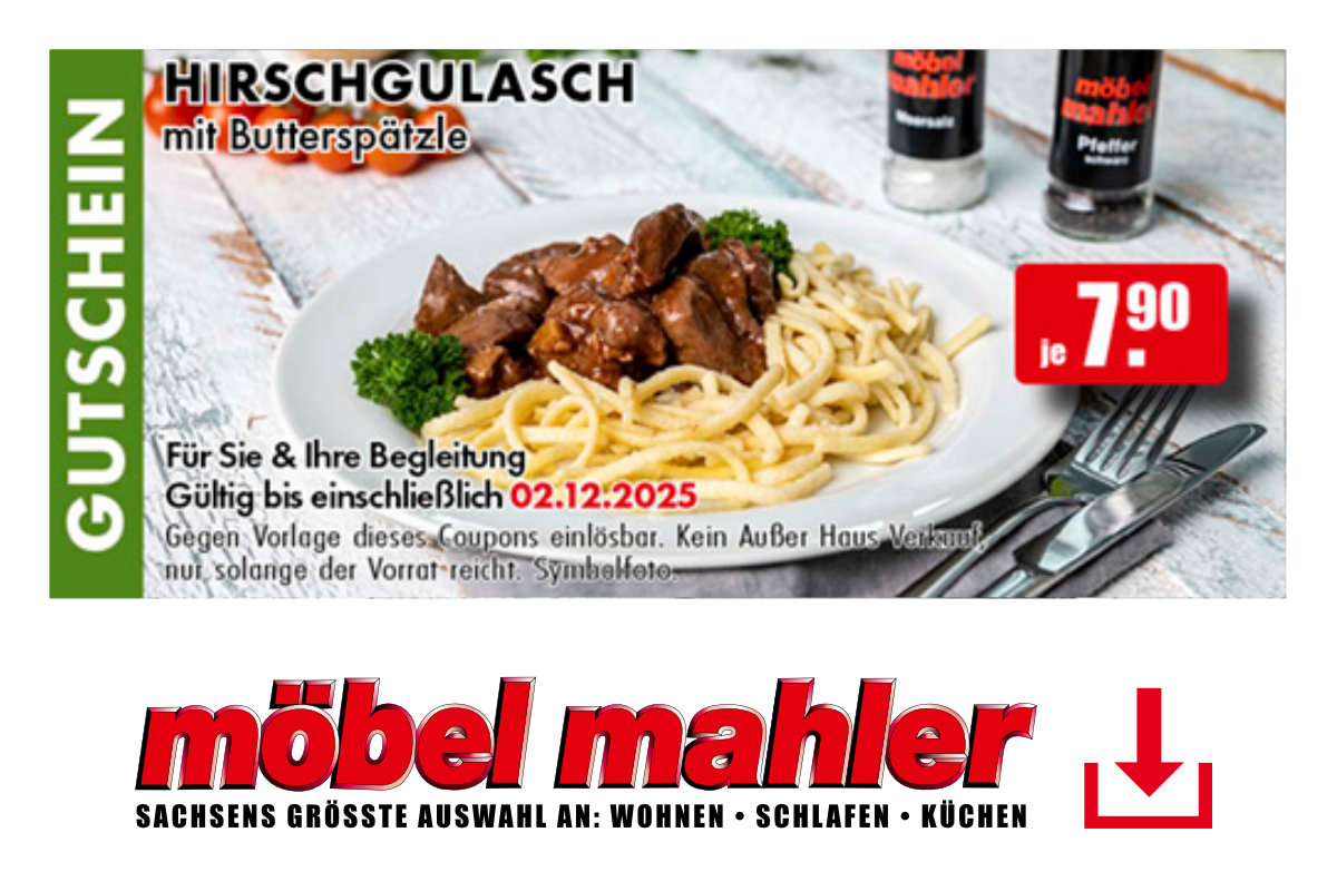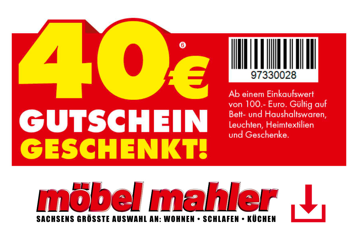 Diesen Betrag verrechnen wir Ihnen bei Vorlage dieses Gutscheins bei Ihrem Möbel Mahler Einkauf ab einem Einkaufswert von 100,-€. Gutschein innerhalb des Aktionszeitraums nur einmal pro Kunde und Kaufvertrag einsetzbar. Ausgenommen von dieser Rabattaktion sind Möbel, Küchen, Matratzen, Gutscheine und Bücher sowie Artikel der Marken ASA Selection, Joop!, Leifheit, Leonardo, Silit, Villeroy & Boch, WMF, Paul Neuhaus und Trio Leuchten. Alle an der Aktion teilnehmenden Artikel in den Prospektbeilagen werden im Aktionszeitraum bereits reduziert angezeigt und gekennzeichnet. Aktuelle Prospekte sind unter www.moebel-mahler-siebenlehn.de einzusehen. Weiterhin ausgenommen sind als Dauertiefpreis gekennzeichnete Artikel. Nicht mit anderen Rabattaktionen kombinierbar. Barauszahlung nicht möglich. Gilt nur für Neuaufträge bis einschließlich 02.12.2025.