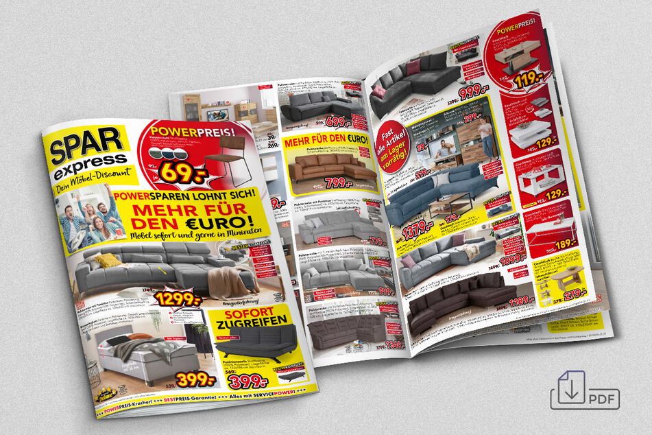 Freut Euch z. B. auf die Polsterecke für 799 statt 1.149 Euro, das Boxspringbett für 999 statt 1.599 Euro oder den Chefsessel für 149 statt 199 Euro.