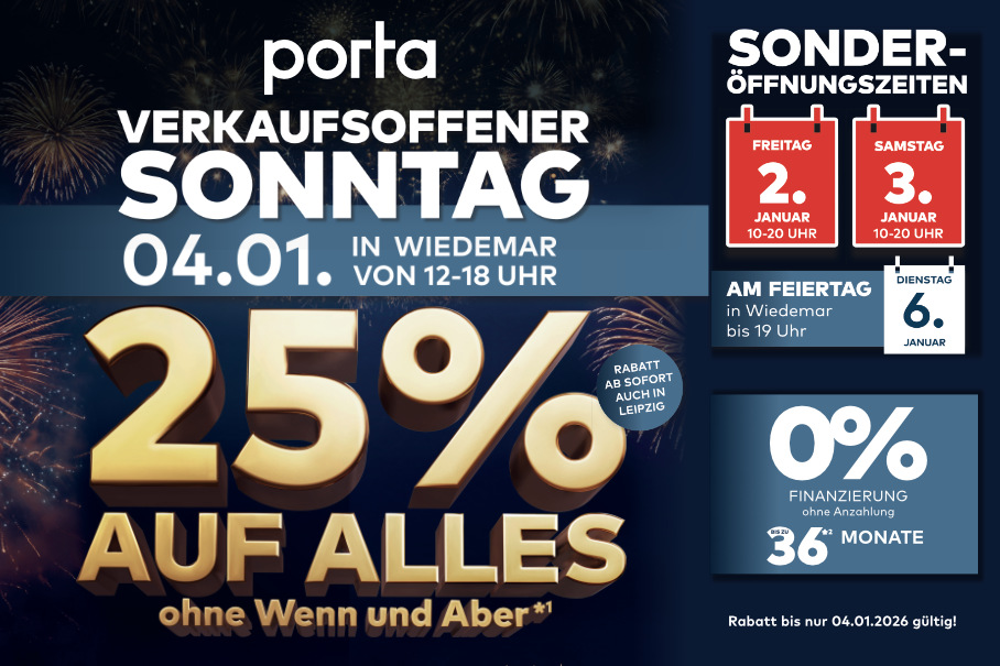 *1 Nicht in Verbindung mit anderen Aktionen und Rabatten. Aktionsbedingungen beim Onlinekauf siehe porta.de. Gültig nur für Neukäufe und gegen Vorlage der Anzeige bis 06.01.2026. Alle in Anzeigen, Prospekten, postalischen Schreiben und Newslettern angegebenen Preise sind Endpreise, die etwaige Rabatte und Aktionsvorteile bereits beinhalten.