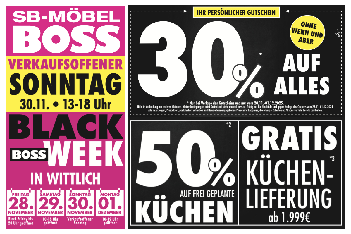 *Nur bei Vorlage des Gutscheins und nur vom 28.11.-01.12.2025. Nicht in Verbindung mit anderen Aktionen. Aktionsbedingungen beim Onlinekauf siehe moebel-boss.de. Gültig nur für Neukäufe und gegen Vorlage des Coupons vom 28.11.-01.12.2025. Alle in Anzeigen, Prospekten, postalischen Schreiben und Newslettern angegebenen Preise sind Endpreise, die etwaige Rabatte und Aktions-vorteile bereits beinhalten.