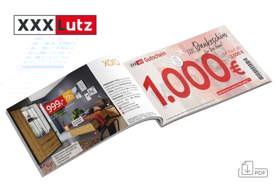 Alle angegebenen Maße sind Zirka-Angaben. Maß-, Farb- und Modellabweichungen, Preisirrtümer und Liefermöglichkeiten vorbehalten. Für Druckfehler keine Haftung. Alle Preise sind Abholpreise, soweit nicht anders angegeben. Keine weiteren Nachlässe (insbesondere Gutschein- und Rabattaktionen) auf die in dieser Werbung angebotene Ware möglich. Aktionen und Aktionsbedingungen sowie weitere Informationen finden Sie unter xxxlutz.de/aktionsbedingungen. Artikel im Online-Shop immer zum Freundschaftskartenpreis – unabhängig jeglicher Rabattaktionen. Angebote unserer Verkaufspartner/Marktplatz-Verkäufer sind von allen Aktionen ausgenommen.