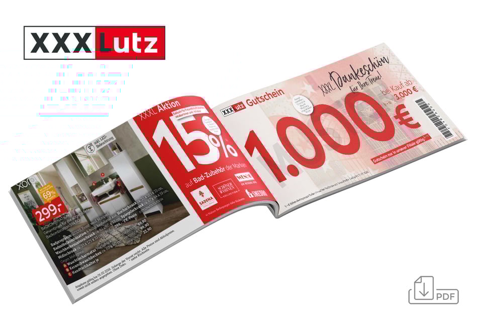 S) Gültig bei Neuaufträgen. Ausgenommen: Artikel in dieser Werbung, in der Ausstellung als „Bestpreis“/„Bester Preis“ gekennzeichnete Artikel, Blomus, Boxxx, Depot, Elle Decoration, JAB, Joop! Teppiche, Leifheit, Musterring, Paidi, Schöner Wohnen, Soehnle, Team 7, Tilo, Tom Tailor Teppiche und Vorwerk, bereits reduzierte Ware, Abverkaufsartikel, Saisonartikel, Badzubehör, Elektro-Kleingeräte, Gutscheinkauf und Bücher. Bei XXXLutz in Blankenburg keine Baby-Artikel platziert, aber bestellbar. Keine Barauszahlung.