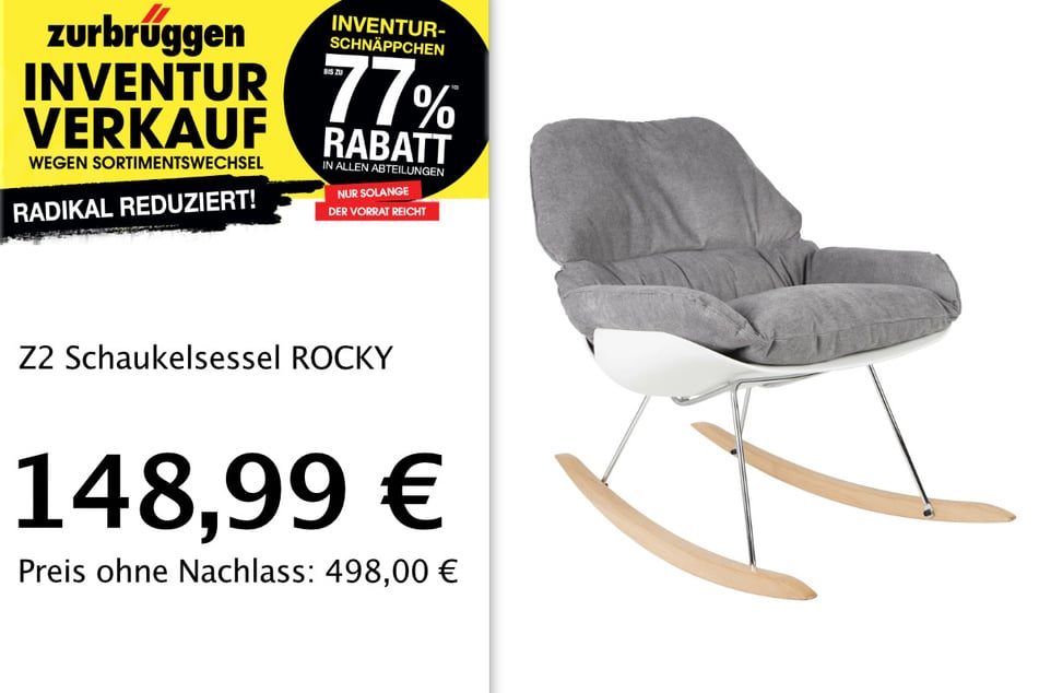 Günstig gibt's zum Beispiel Armlehnstühle für 59,89 Euro, Schwebetürenschränke für 597,94 Euro und Schaukelsessel ROCKY für 148,99 Euro.