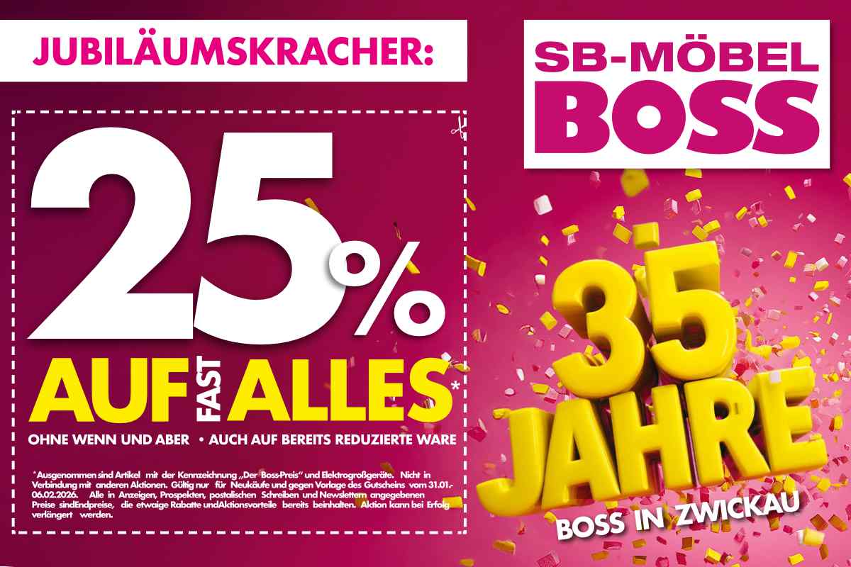 Zwickau – Möbel Boss in Zwickau feiert ein großes Jubiläum! Seit 35 Jahren sind sie Euer Partner für günstige Einrichtung.