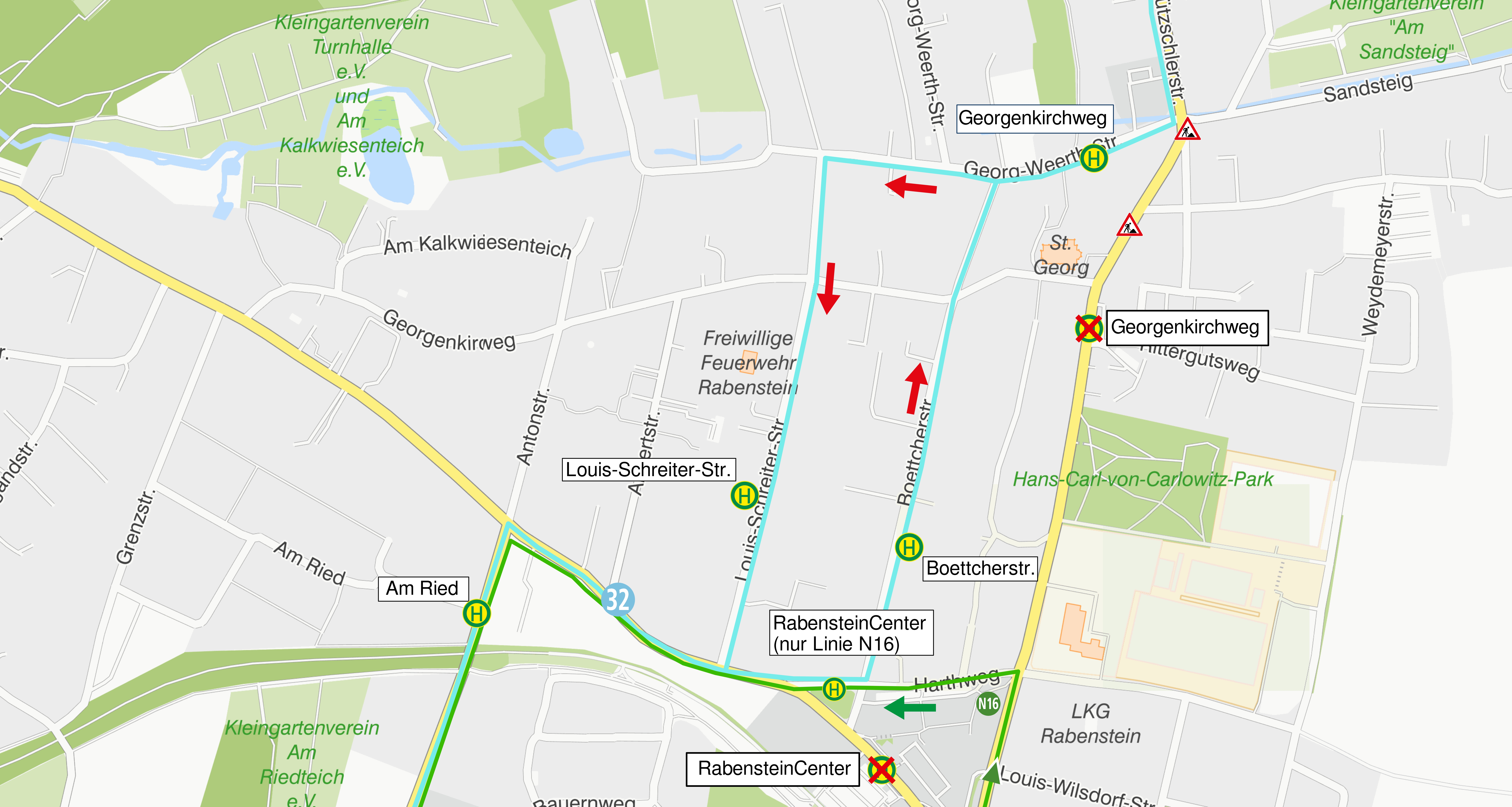 Aufgrund von Straßen-, Kanal- und Leitungsarbeiten kommt es ab Montag zur Vollsperrung der Trützschlerstraße zwischen Kieselhausenstraße und Georg-Weerth-Straße. Die Umleitung führt über Oberfrohnaer Straße - Böttcherstraße bzw. Louis-Schreiter-Straße - Georg-Weerth-Straße. Die Linien 32 und N16 der CVAG verkehren umgeleitet. Hier findet Ihr eine Übersichtskarte. Die Arbeiten sollen nach Angaben der CVAG bis voraussichtlich 30. Oktober dauern.