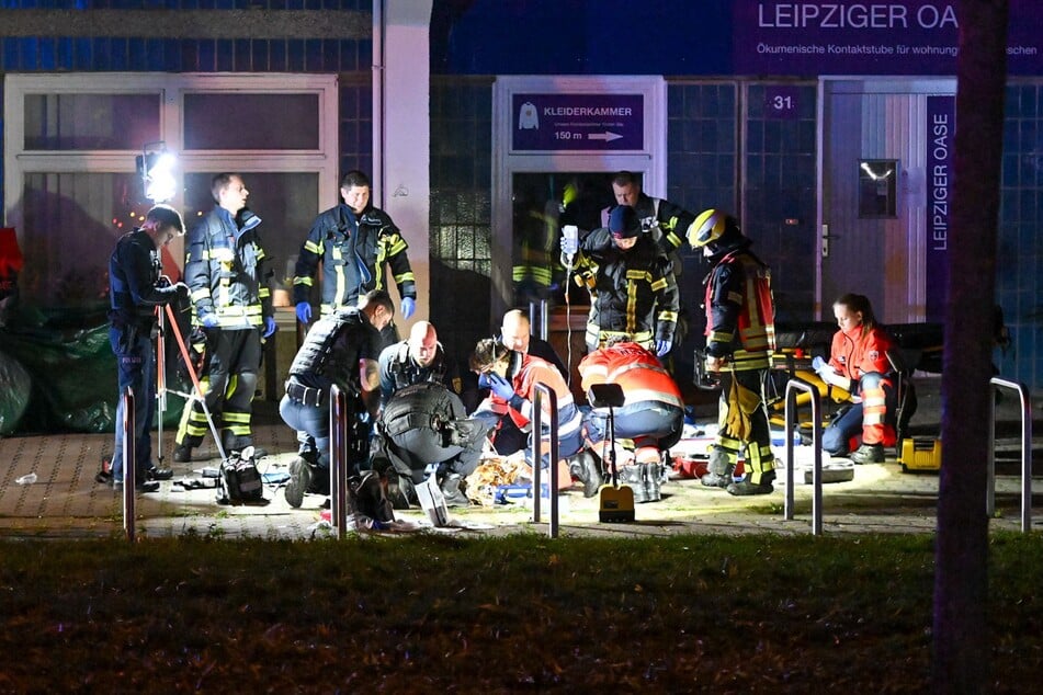 Kräfte von Polizei, Rettungsdienst und Feuerwehr befanden sich am Dienstagabend vor Ort. Bilder zeigen, wie eine Person behandelt wurde. Der Vorfall ereignete sich vor einer Obdachlosenunterkunft.